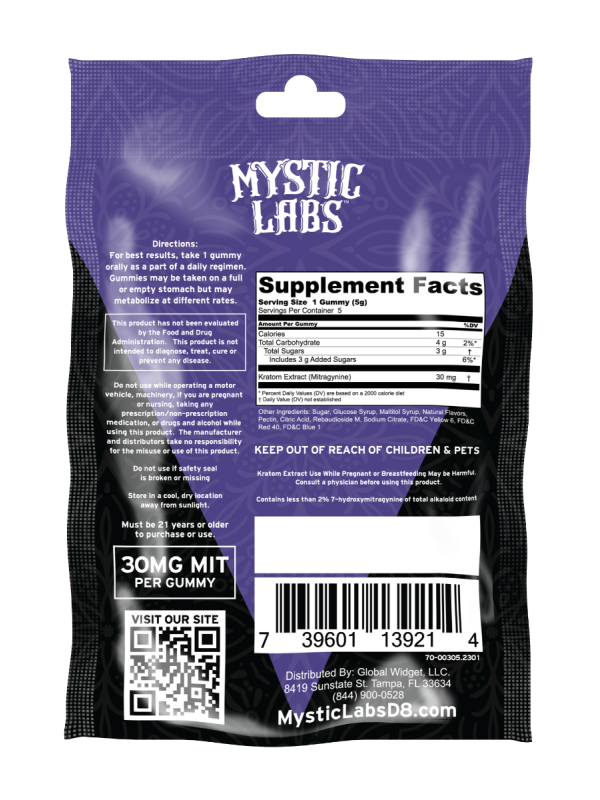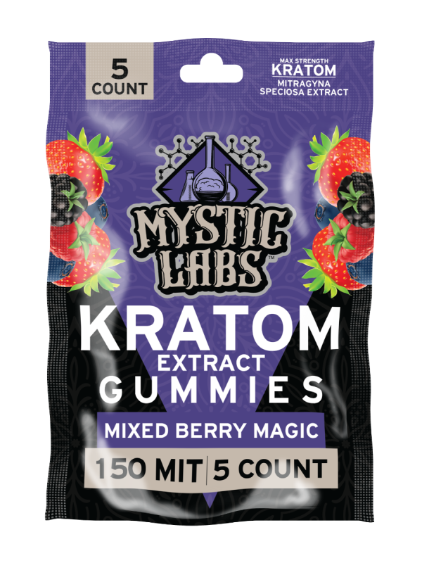 Mystic Labs™ 5ct Kratom Gummies deliver the all-encompassing effects of Kratom in a bite-sized edible. Our Kratom-infused gummies feature a delicious mixed berry flavor and contain a max-strength 30mg serving of Mitragynine (MIT) per gummy.