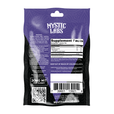 Mystic Labs™ 5ct Kratom Gummies deliver the all-encompassing effects of Kratom in a bite-sized edible. Our Kratom-infused gummies feature a delicious mixed berry flavor and contain a max-strength 30mg serving of Mitragynine (MIT) per gummy. Product Info 30mg of Mitragynine (MIT) per gummy 5 gummies per bag 150mg of Mitragynine (MIT) per bag Mixed Berry flavor Tested by Indpendent Labs Manufactured in the USA